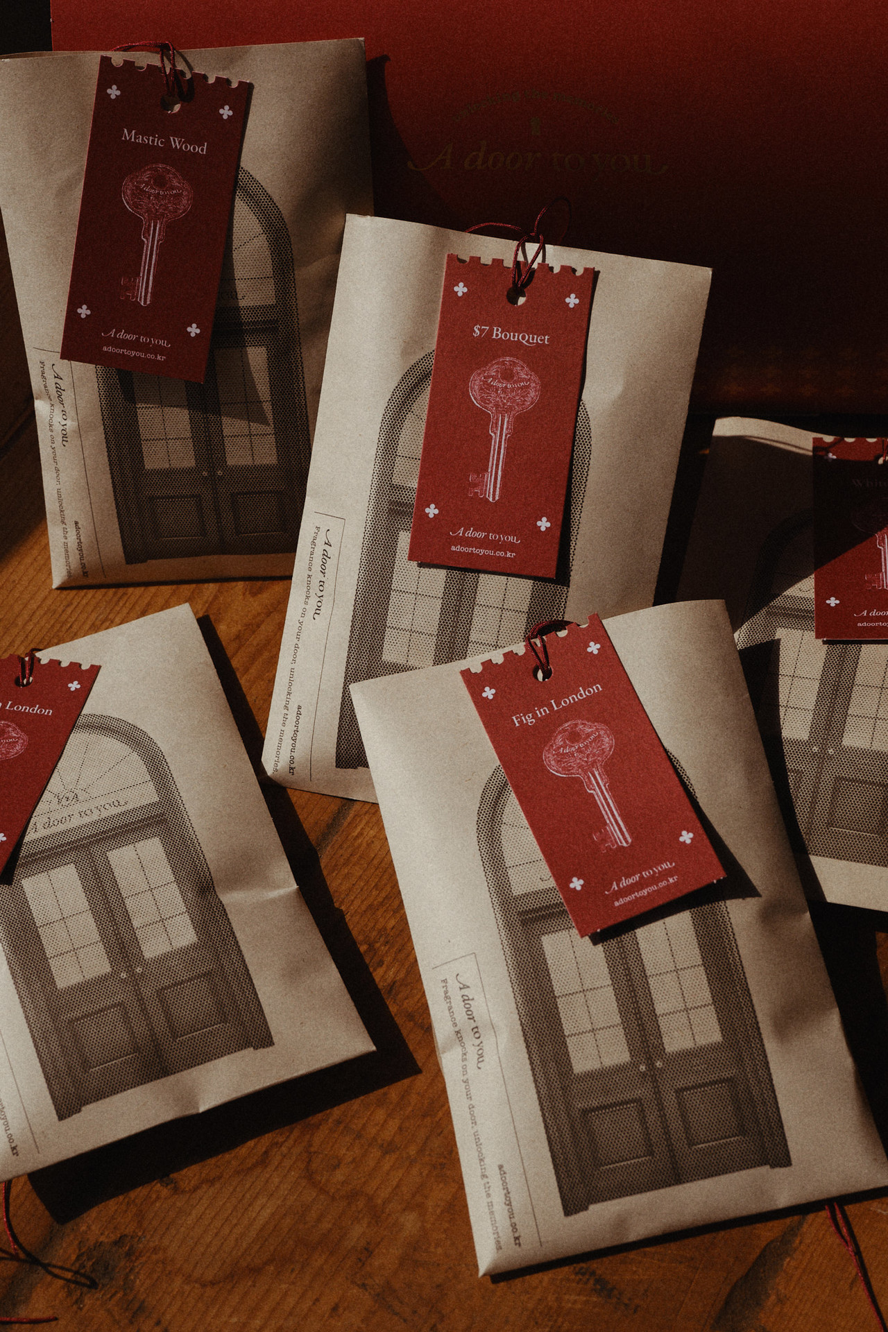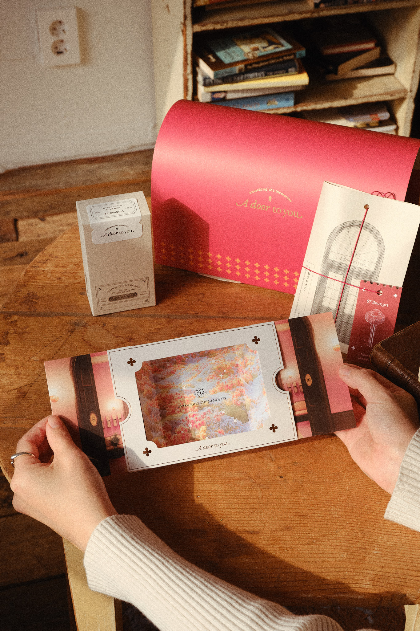 브랜드 세계관의 중심은 ‘우체국’과 ‘메신저’입니다. “A Door To You”라는 이름이 가진 의미인 '기억의 문을 열어주는 존재'를 시각적으로 풀어내기 위해, 디자인 요소 곳곳에 은유를 심었습니다.
