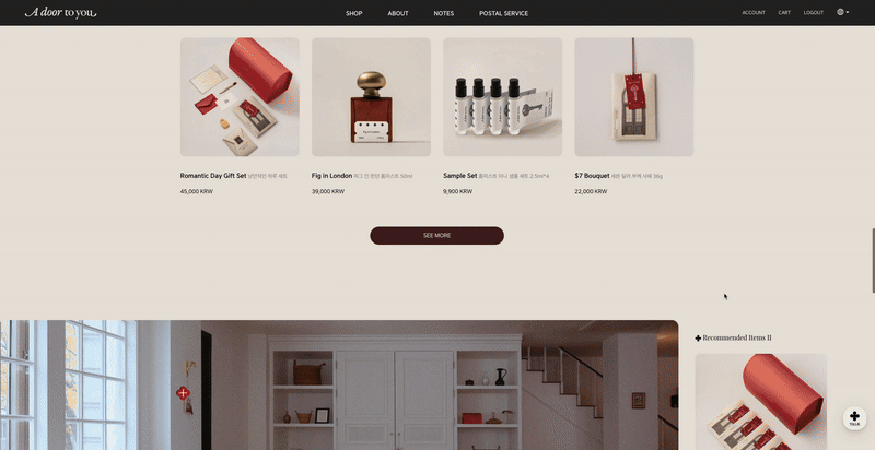 웹사이트는 단순한 쇼핑 플랫폼을 넘어서 누군가의 방, 누군가의 일상에 초대받은 듯한 인상을 주고 싶었습니다. 향을 고르고, 마음을 담고, 누군가를 떠올리는 그 조용한 낭만이 공간감 속에서 자연스럽게 느껴지길 바랐고, 이를 위해 수많은 공간을 리서치하고 직접 스튜디오를 찾아 사진을 촬영했으며, 웹 전반에 그 무드를 담기 위한 섬세한 보정 작업도 병행했습니다.