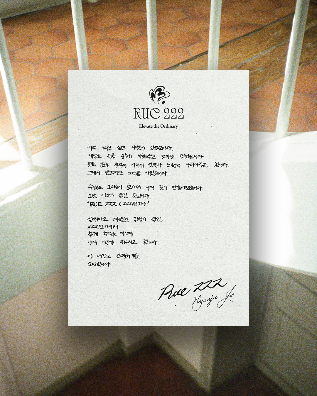 RUE222는 단순히 의류 브랜드에 그치지 않고, 라이프스타일 제품으로 확장하며 평범한 일상을 특별하게 만드는 라이프스타일을 제안합니다. 브랜드 에센스인 'Elevate the Ordinary'는 이러한 철학을 가장 잘 담아낸 문구로, RUE222가 고객들에게 전달하고자 하는 핵심 가치를 상징합니다.